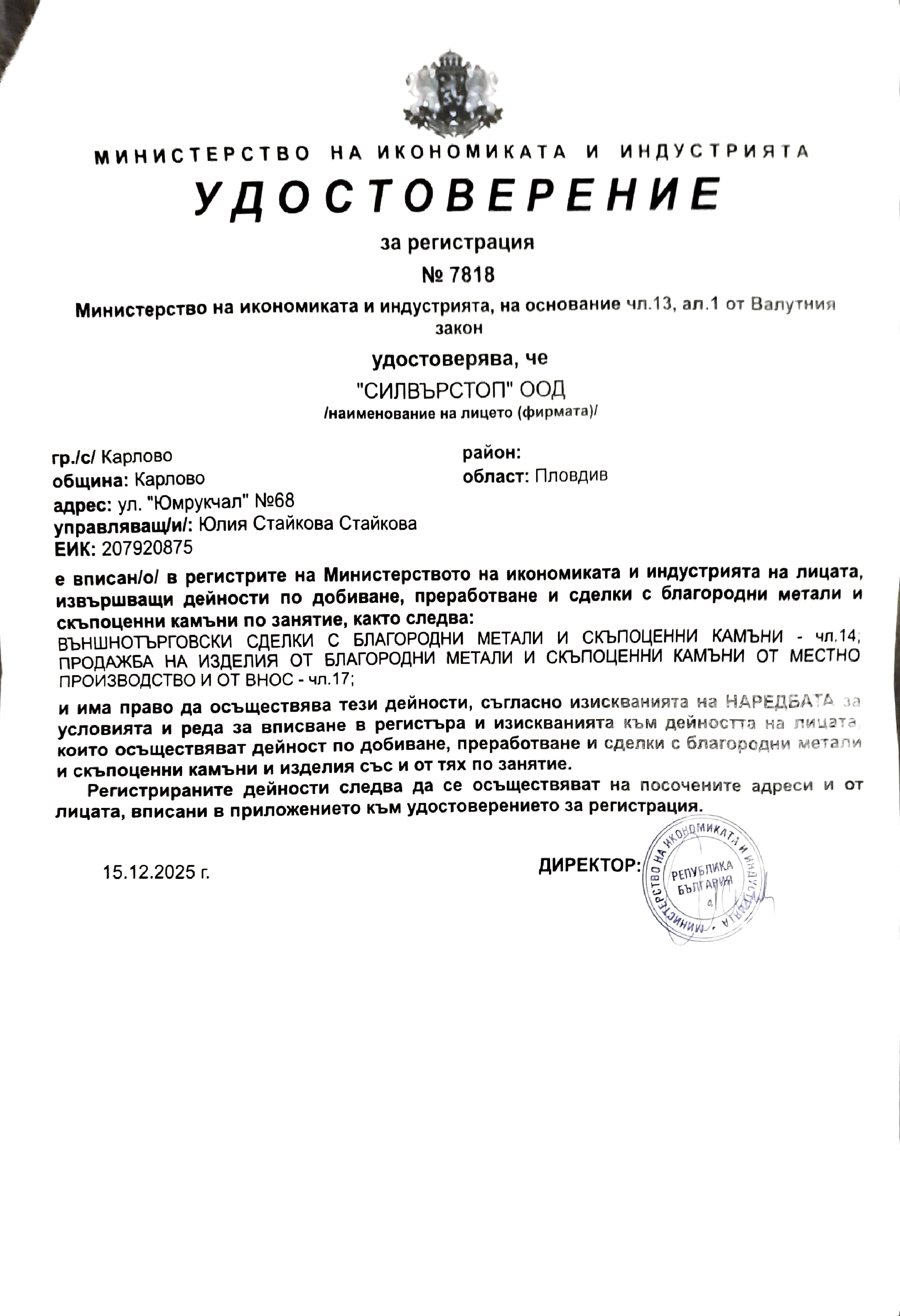 Silverstop.bg e собственост на юридическо лице „Силвърстоп“ ООД, ЕИК: 207920875 и извършва напълно законосъобразна търговия с благородни метали и скъпоценни камъни. По-долу можете да видите прикачен валиден лиценз (Удостоверение), издаден от компетентния орган с описание на разрешените дейности.