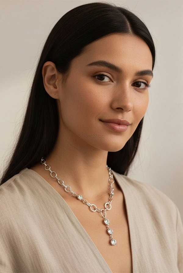 Това елегантно сребърно колие (925 проба) е произведено в България и излъчва изтънченост и стил. Верижката е с дължина 47 см, предоставяйки комфорт при носене. Централният елемент на колието са циркониеви камъни с размер 6.00 мм, които придават изключителен блясък и привлекателност.