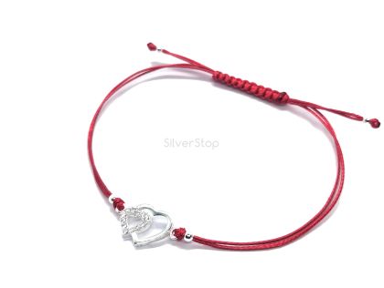 Сребърна гривна с червен конец "Сърце" с циркониеви камъни 1.30 мм – Символ на любов и защита.