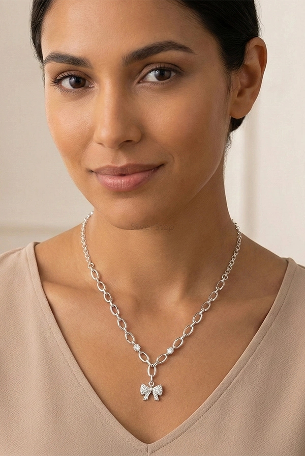 Сребърното колие с елемент панделка е изтънчен символ на женственост и деликатност. Изработено от висококачествено сребро (проба 925), това бижу е създадено в България и впечатлява със своя изчистен, но ефектен дизайн.